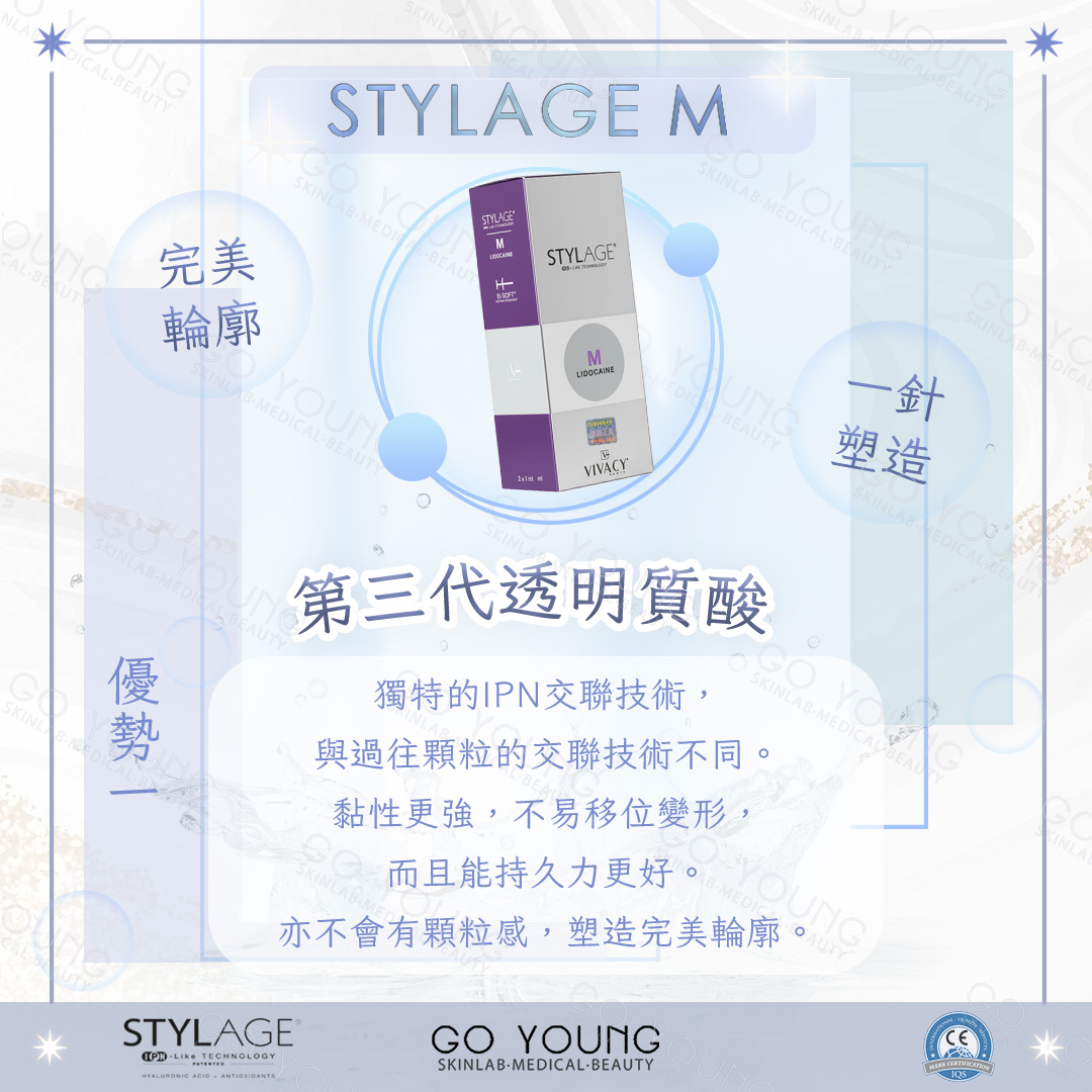 A:Stylage M 是第一個創新的單相凝膠組成的交聯透明質酸(專利IPN技術)和天然抗氧化劑。 創新加入抗氧化劑甘露醇技術,分為S,M,L,XL,XXL,Lips,Hydro,Hydro Max 8種型號。